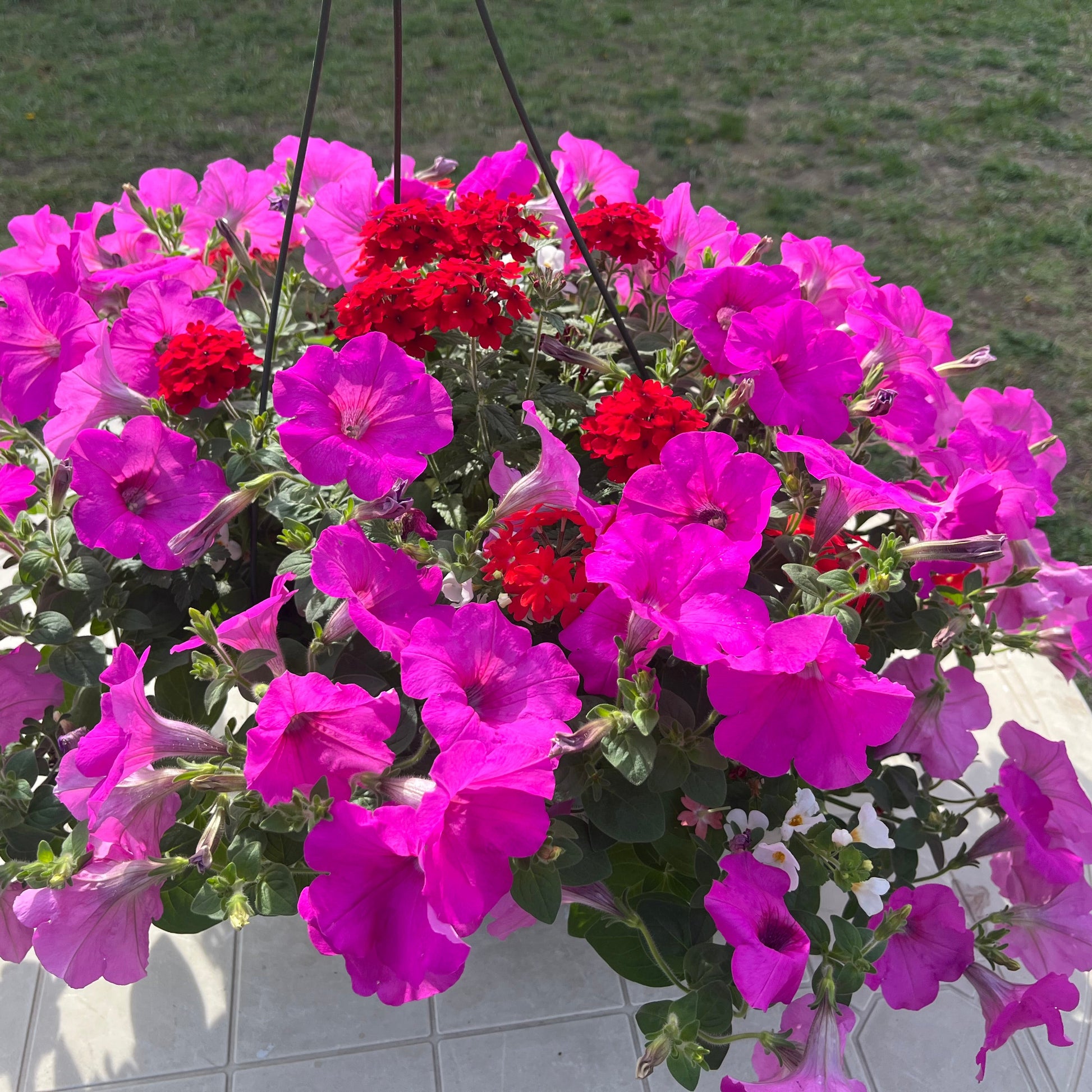 Petunia wave rose (hot pink), Verbena purple, Bacopa white. Prefers sun